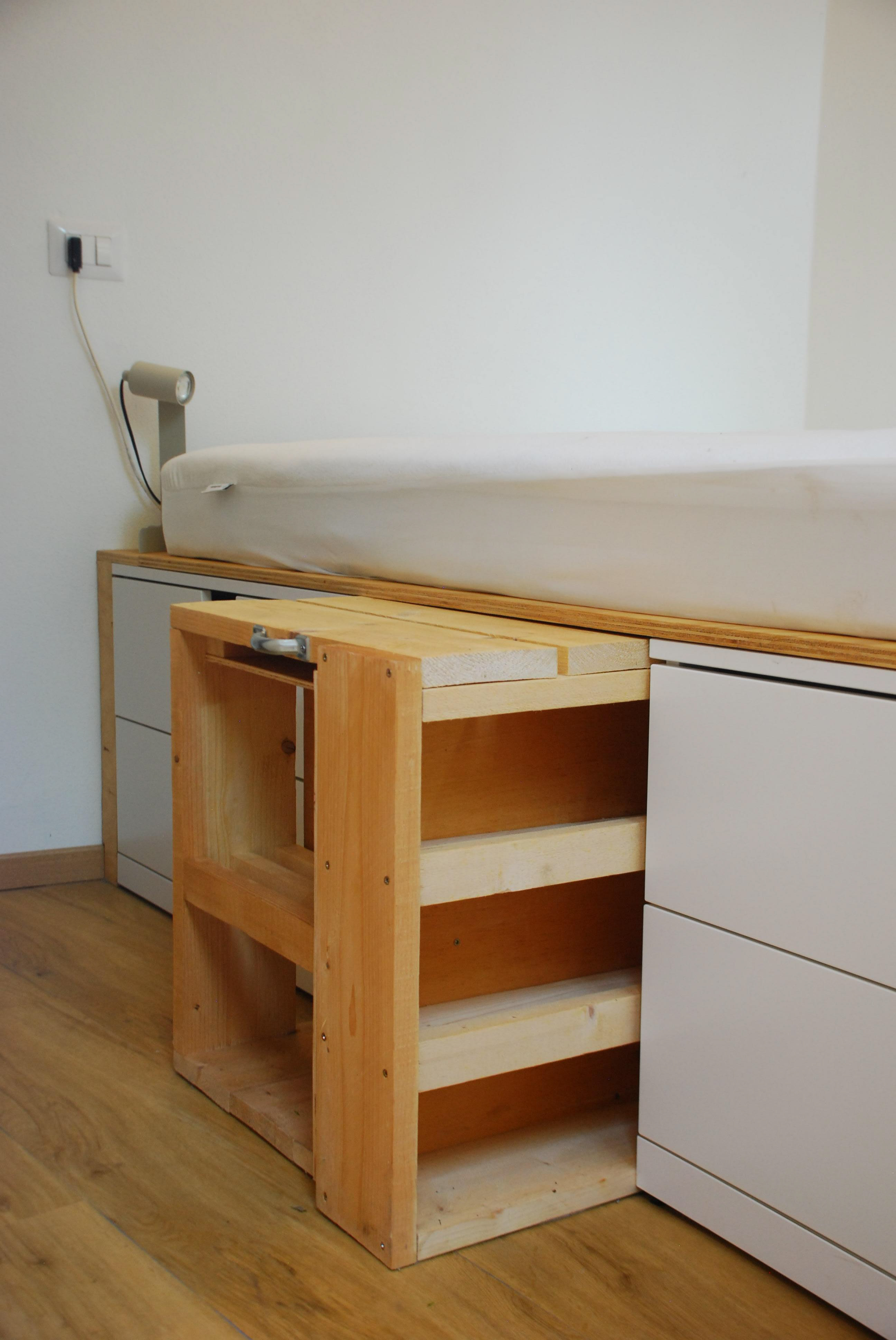 In 2023, I designed and constructed a bed for a small garden bedroom. The bed is made of a frame, two IKEA chests of drawers, and a custom wooden multifunctional storage unit.